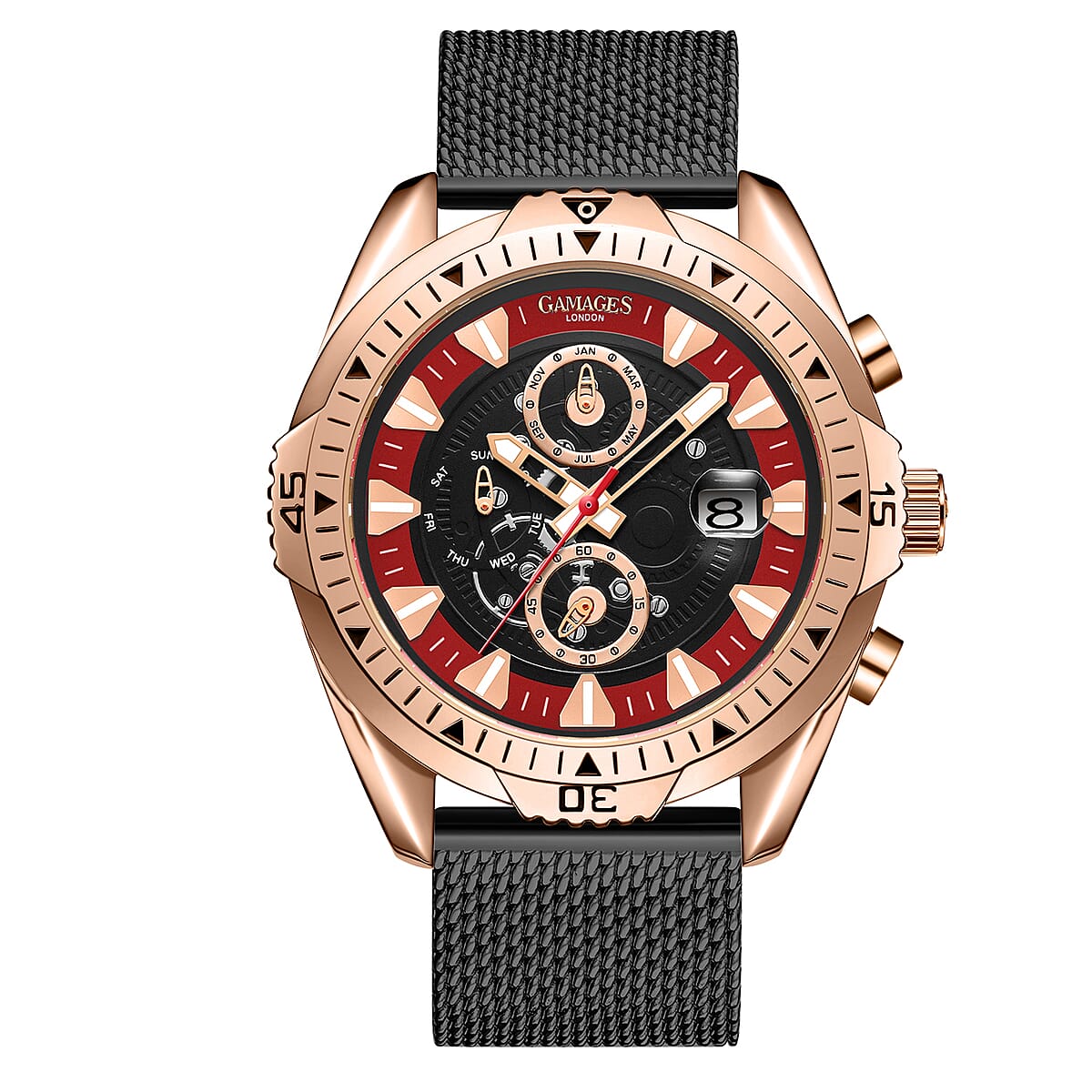 GAMAGES OF LONDON Limited Edition Hand Assembled Vanguard Automatic Movement Black Mesh Strap Watch with ION Plated RG (45mm) with FREE GIFT PEN
