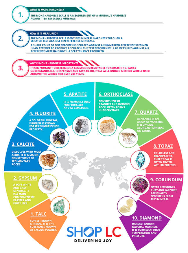 The Mohs hardness scale identifies mineral hardness through a scratch test against ten reference minerals.