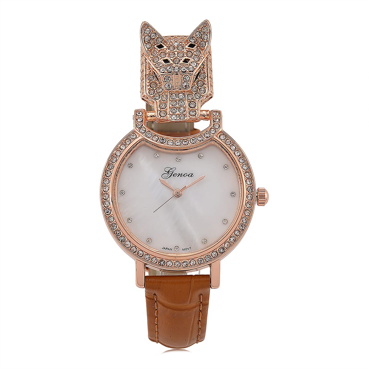 Command attention with this GENOA leopard head watch featuring Austrian crystals. This luxury timepiece showcases intricate enameled detailing. The leather strap offers comfort and a distinctive style. It makes a powerful statement about your refined taste.
