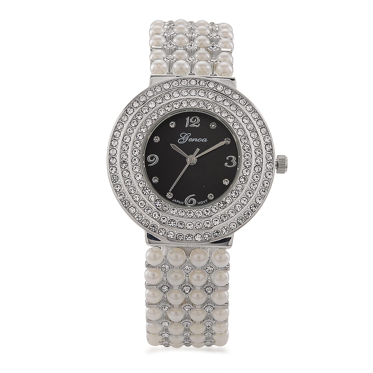Genoa Austrian Crystal, Simulated Pearl Japanese Movement Black Dail Watch in Silvertone