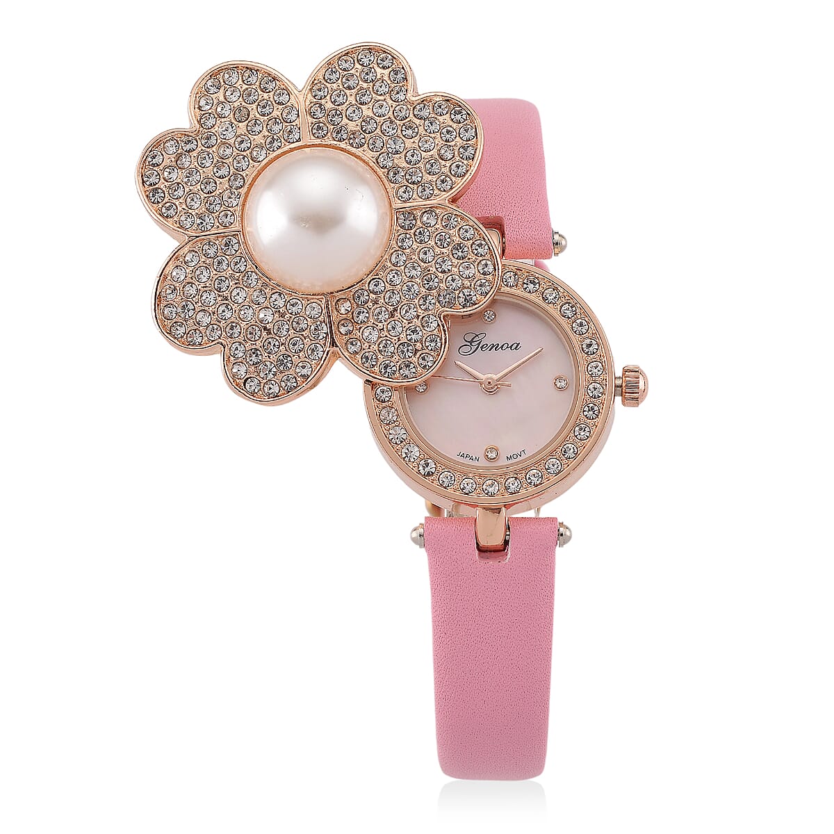 Genoa Austrian Crystal, Simulated Pearl Miyota Japanese Movement Watch in Pink Leather Strap