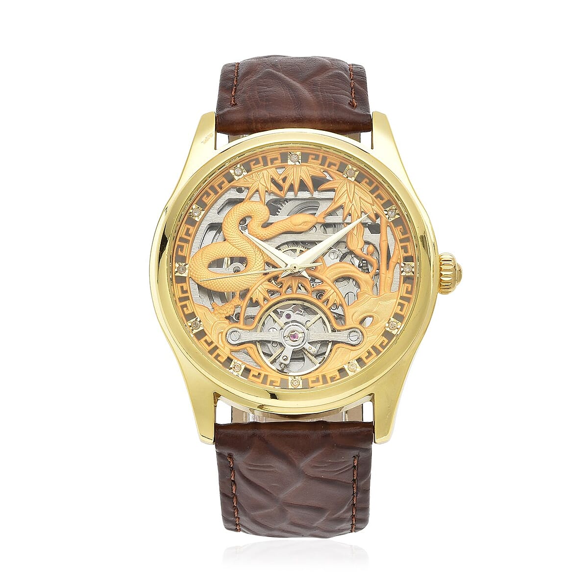 Genoa Diamond Automatic Mechanical Movement Snake Pattern Dial Watch with Brown Genuine Leather (44mm) (7.75-9.0Inches) 0.10 ctw