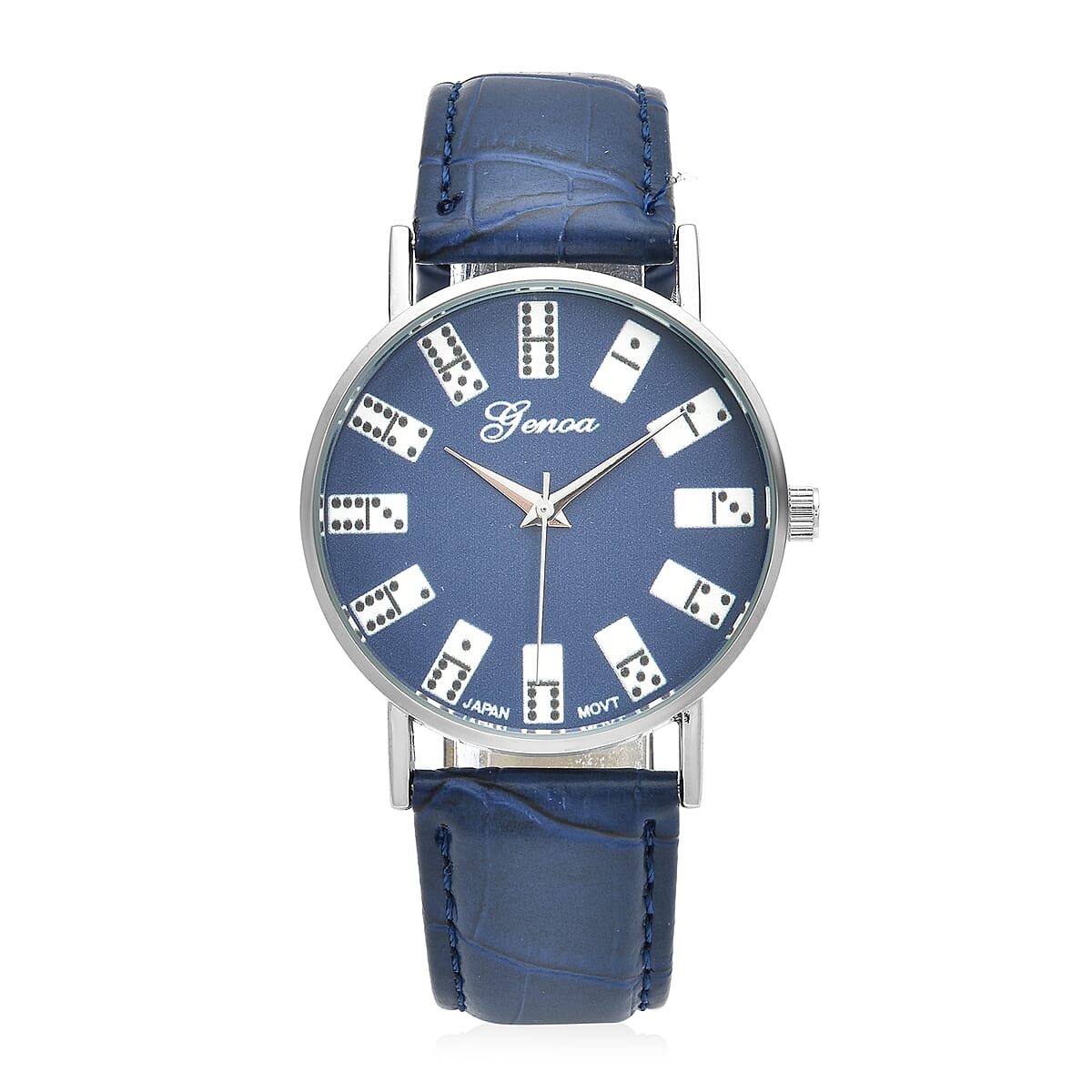 Genoa Miyota Japanese Movement 3D Domino Pattern Dial Watch in Silvertone with Navy Blue Faux Leather Strap (37mm)