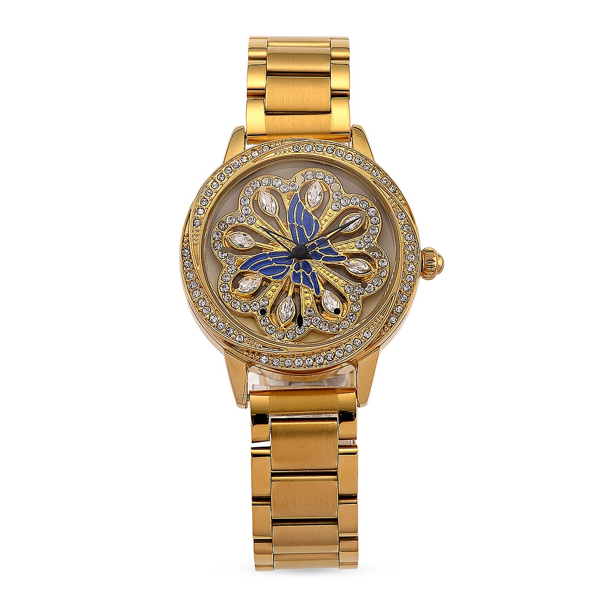 Genoa White Glass Japanese Movement Butterfly Enamel Watch in Goldtone