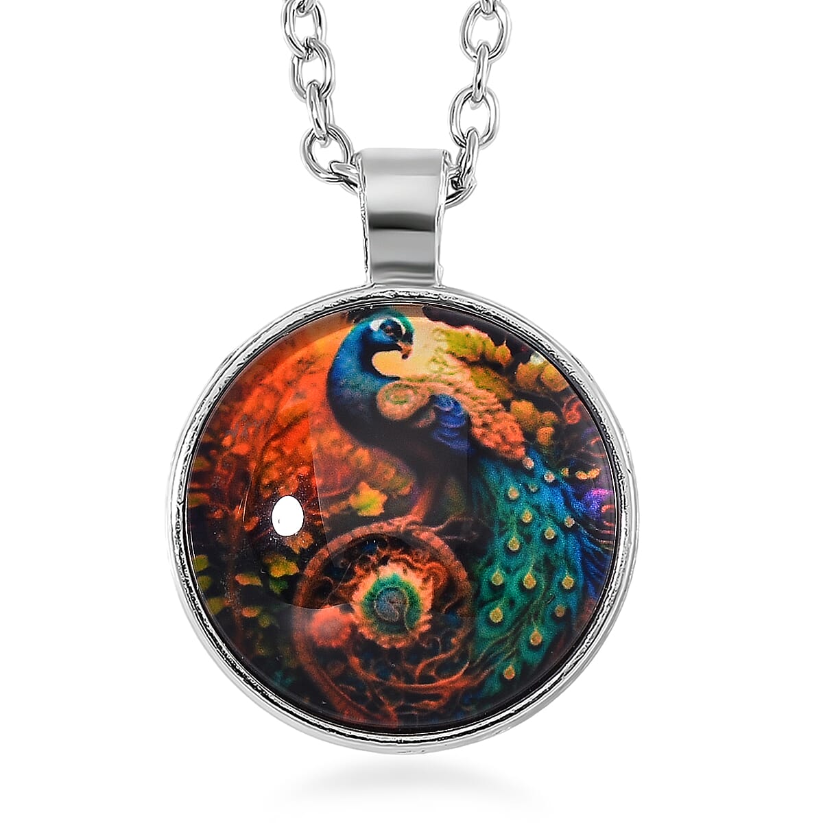 Glass and Enameled Peacock Pendant Necklace in Silvertone 20-22 Inches