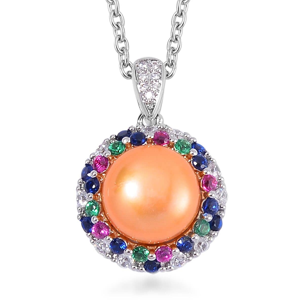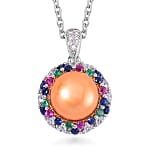Golden Freshwater Cultured Pearl and Simulated Multi Color Diamond Pendant in Silvertone with Stainless Steel Necklace 20 Inches