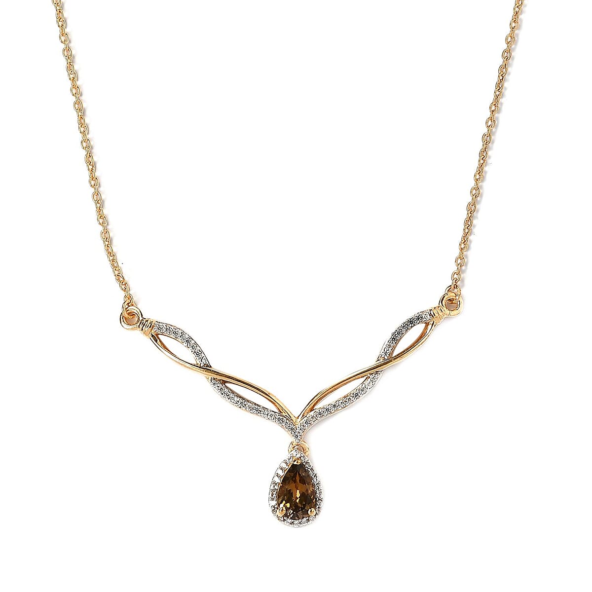 Adds marvelous sparkle to the neckline, this natural golden tanzanite and natural white zircon necklace is skillfully designed jewelry to embrace buffed luster of a gemstone. V-shaped twisted metallic frame with tanzanite drop charm looks fascinating with zircon accents embellishment. Crafted in yellow gold vermeil-plated sterling silver, this necklace is secured with a designer clasp. This design necklace features 18inches of princess length. Tanzanite is popularly known as the "Gemstone of a Generation" owing to its rarity, making it all sorts of perfect for your nonpareil collection.