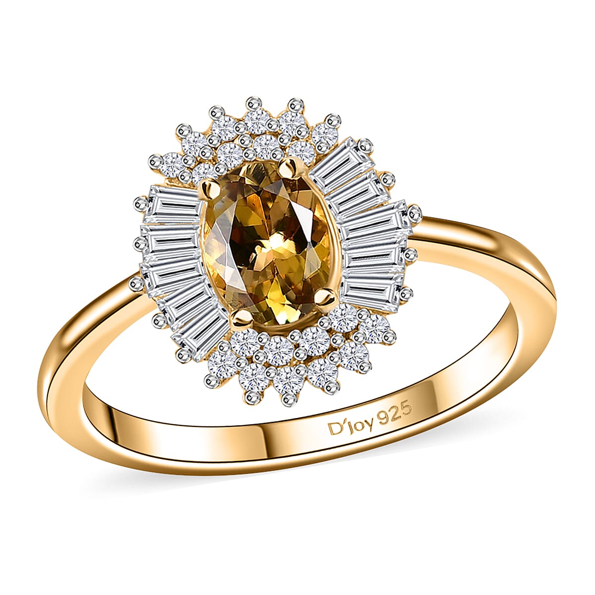 This golden tanzanite ring features a stunning oval-shaped golden tanzanite at its center, accentuated by round and baguette-cut white zircons. Crafted in 18K vermeil yellow gold over sterling silver, the prong setting enhances the brilliance of the gemstones, creating a timeless piece of jewelry.
