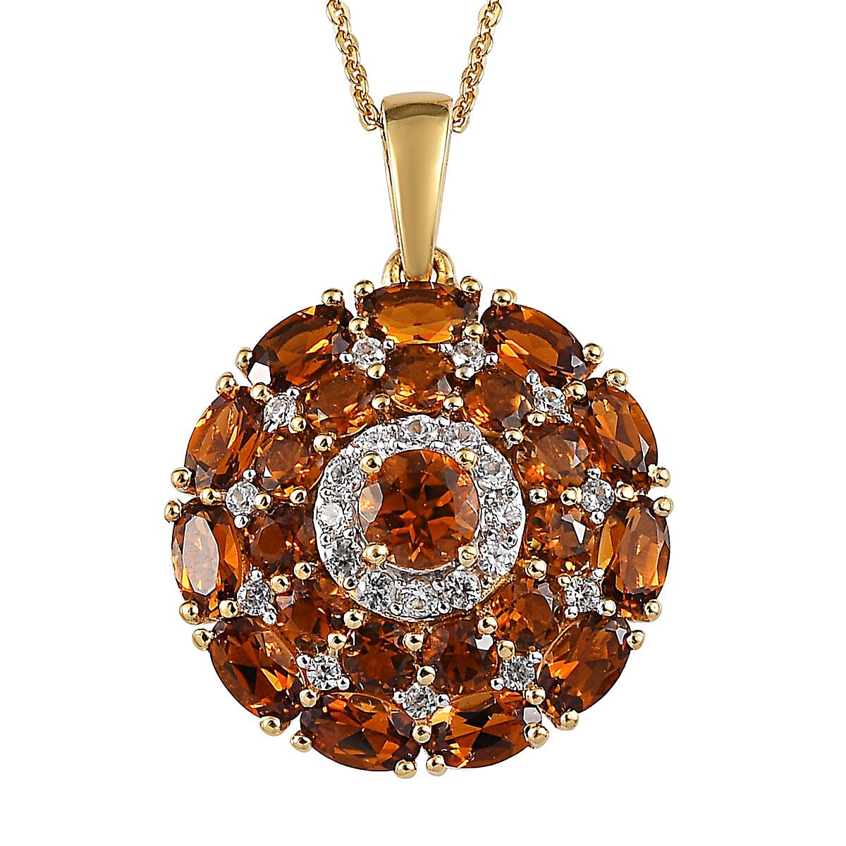 Bewilder people with sparkling beauty on your neck! This Natural Tanzanian Golden tourmaline and natural white zircon pendant necklace is simply enticing and showcases a splendid glamour to your appearance and makes you celebrate femininity. The jewel is exceptionally designed in a classic prong setting with a beautiful triple halo pattern decked with Tanzanian Golden tourmaline in the center, surrounded by zircon studded halo and further surrounded by Tanzanian Golden tourmaline double halo. Golden tourmaline is a 100% natural gemstone. Golden is the rarest color, varying from vibrant to champagne yellow with a display of hues and brilliance. This Natural Tanzanian Golden tourmaline and zircon pendant necklace is embedded with the exceptional beauty of alluring gemstones to charm up your casual look. This matinee-length pendant necklace features yellow gold vermeil-plated sterling silver crafting and matinee length.