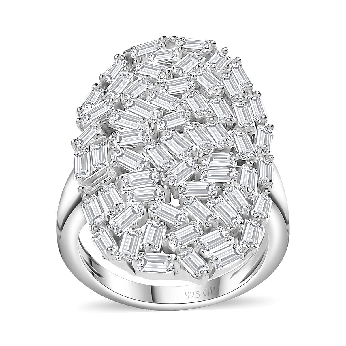 The GP white zircon ring in sterling silver is a sophisticated cluster ring for women, symbolizing unity. This silver ring features baguette-shaped white zircon gemstones, known for their shine, durability, and affordability.