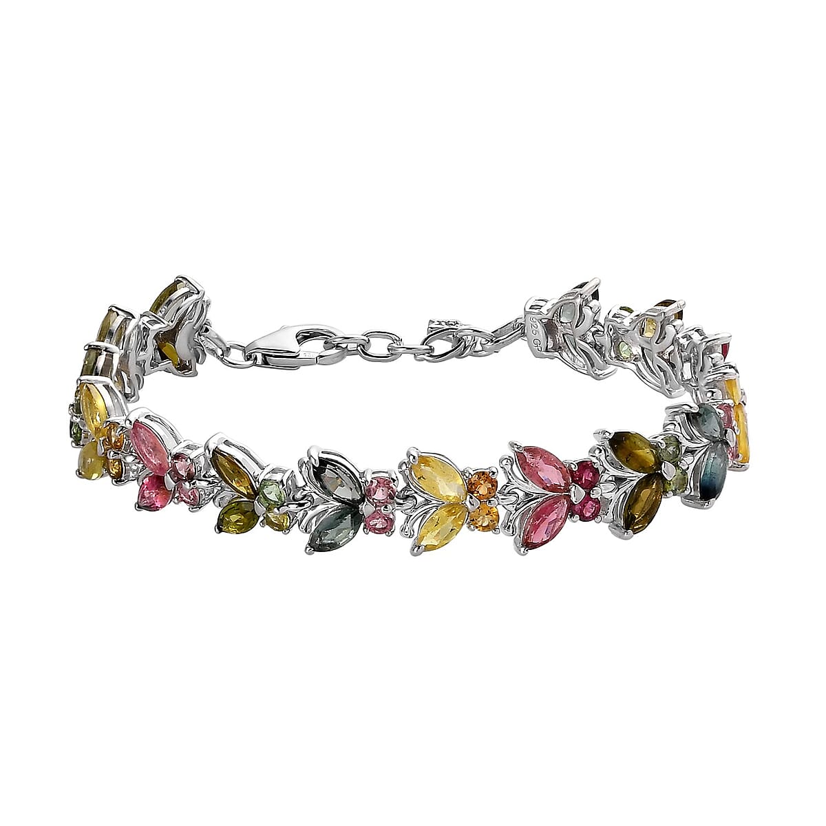 Inspired by the butterflies fluttering on the flowers, this multi-tourmaline bracelet in silver is a remarkable addition to your collection. Butterflies are symbolic of hope and transformation. Marquise and round-shaped tourmalines are set, forming a symmetrical arrangement. This bracelet is crafted in sterling silver with a platinum finish. The bracelet is excellent for those who love unique and natural gemstone jewelry.