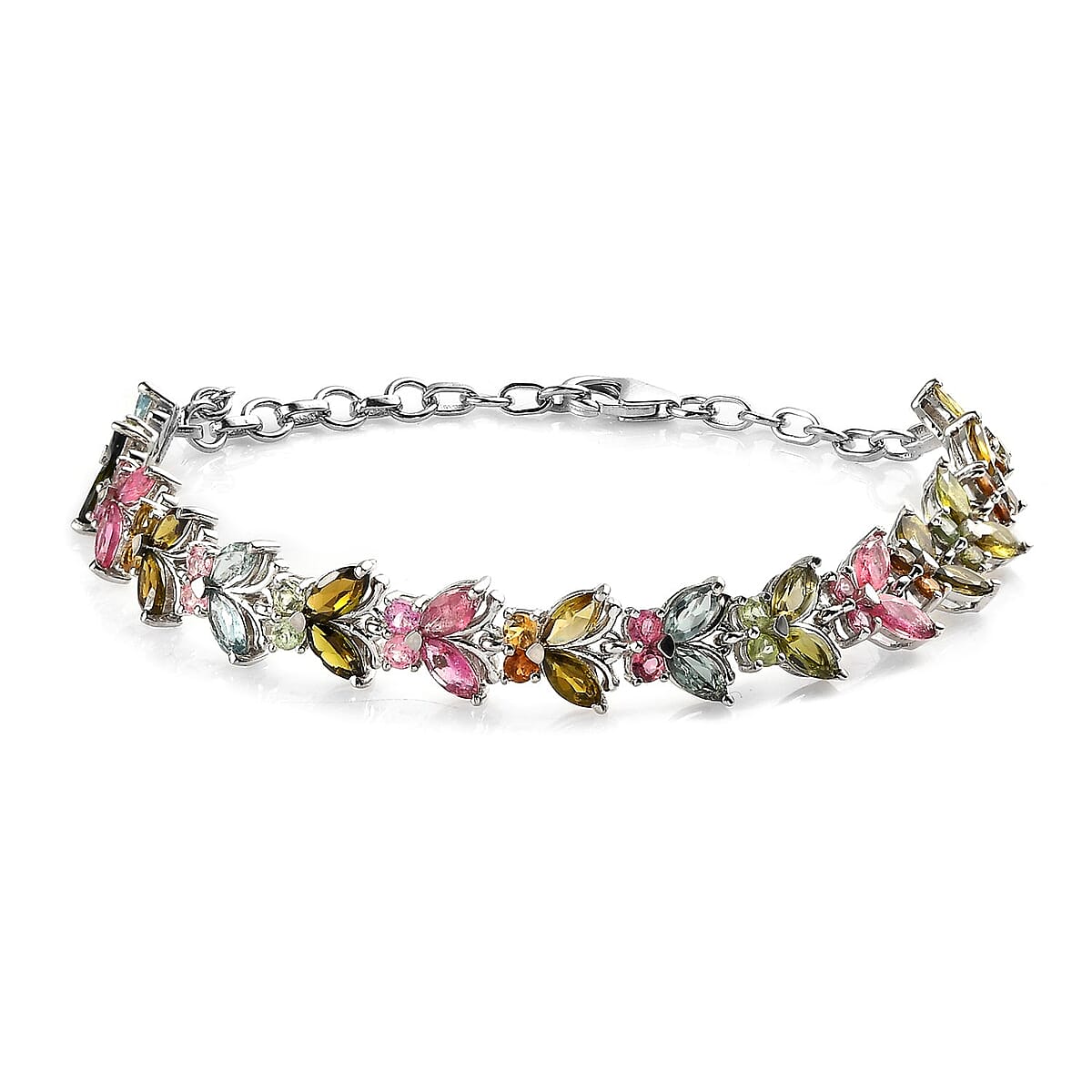 Inspired by the butterflies fluttering on the flowers, this multi-tourmaline bracelet in silver is a remarkable addition to your collection. Butterflies are symbolic of hope and transformation. Marquise and round-shaped tourmalines are set, forming a symmetrical arrangement. This bracelet is crafted in sterling silver with a platinum finish. The bracelet is excellent for those who love unique and natural gemstone jewelry.