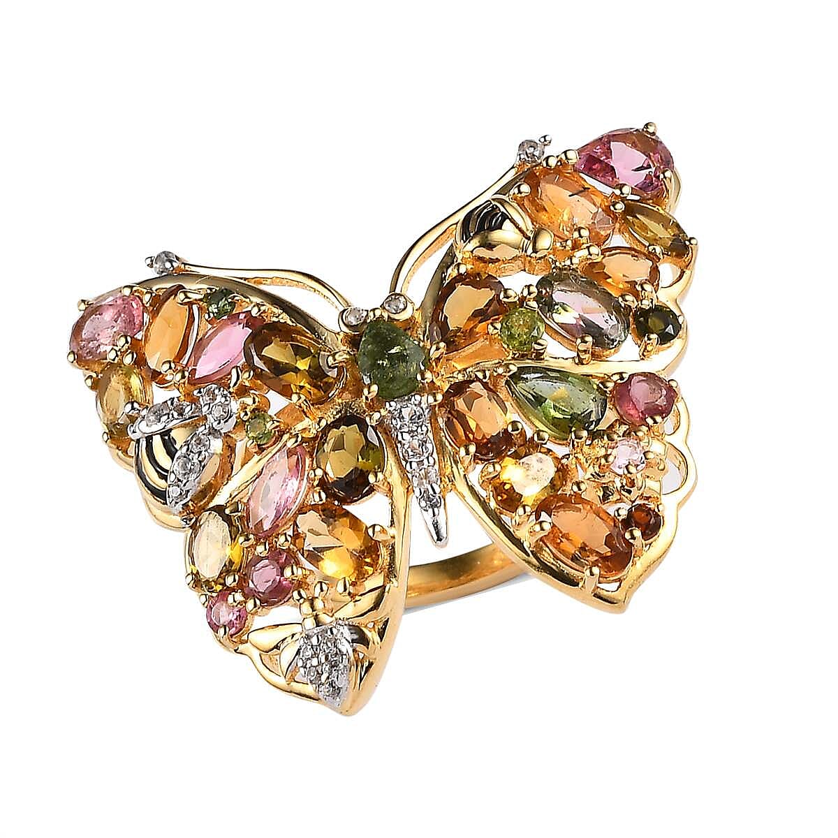 GP Trionfo Collection Premium Multi-Tourmaline and White Zircon Butterfly Ring in Vermeil Yellow Gold Over Sterling Silver (Size 5.0) 4.90 ctw