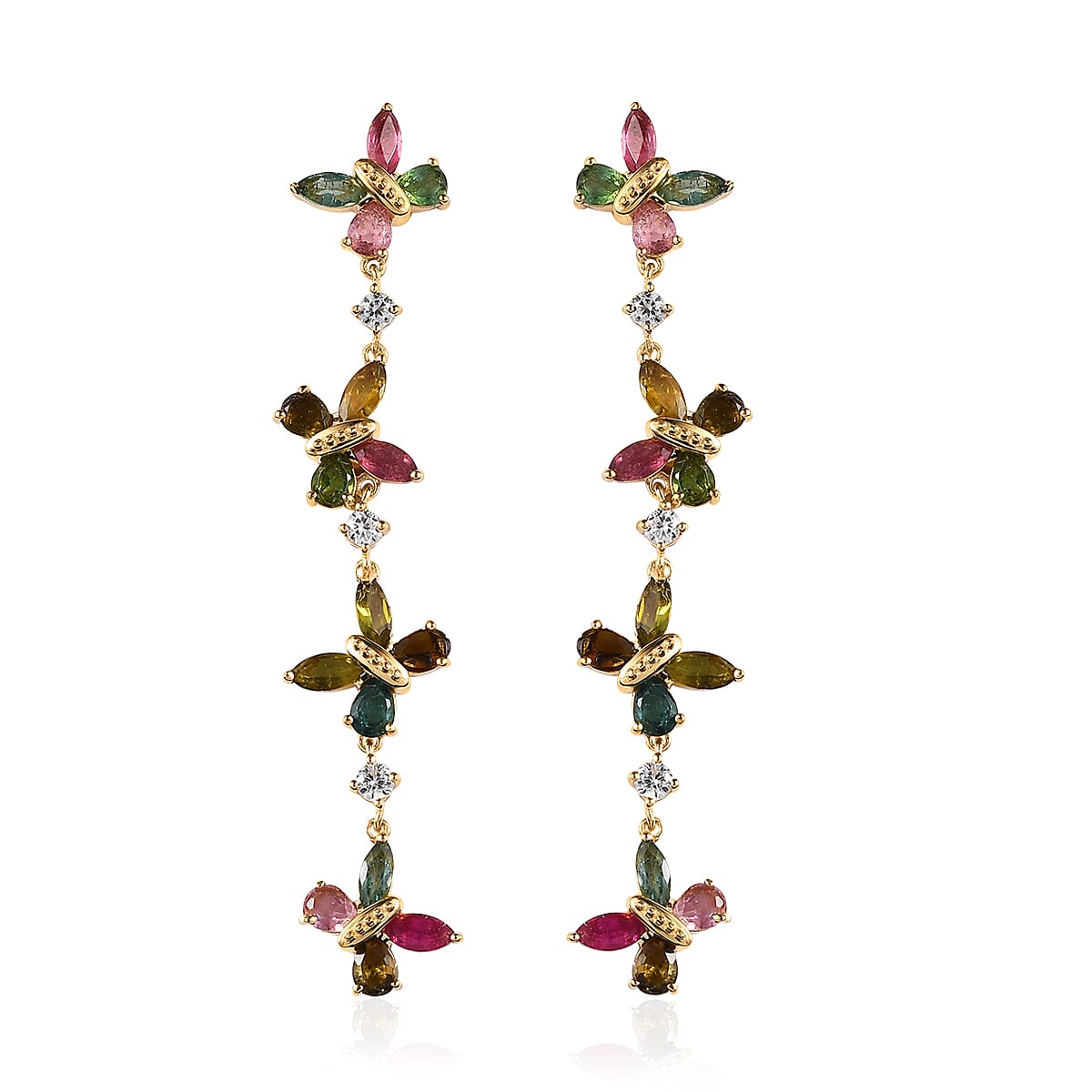 Embrace the vivid hues of these premium multi-tourmaline and white zircon earrings meticulously crafted in vermeil yellow gold over sterling silver. The futuristic yet pioneering craftsmanship elevates the classic butterfly symbolism to a revolutionary realm of beauty and joy. Seize this masterpiece's spontaneous joyfulness and enrich your jewelry collection with a touch of innovation and elegance.