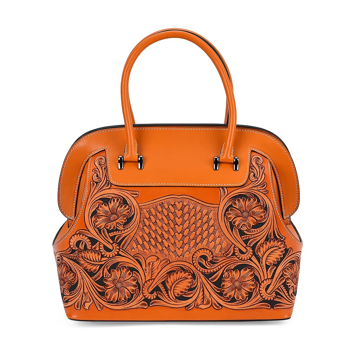 Grand Pelle Royal Collection Orange with Solid Color Hand Engraving Flower Pattern Genuine Leather Tote Bag with Handle Drop