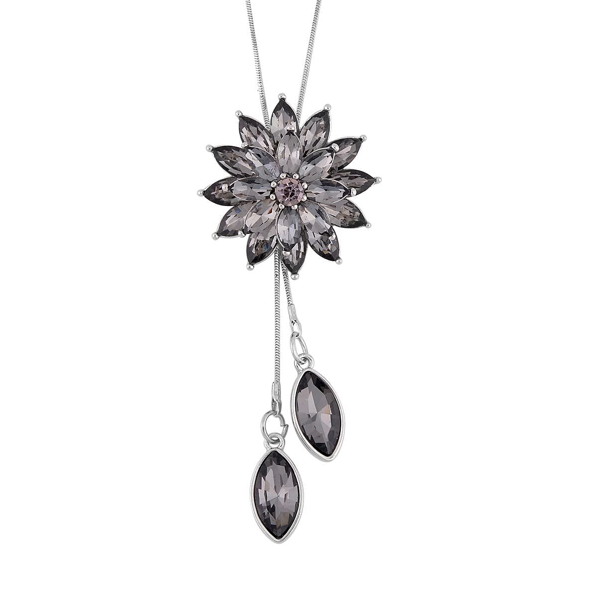 The Austrian crystal lariat necklace is a stunning jewelry that combines elegance and sophistication. This necklace features a delicate silver-toned chain, which is adorned with sparkling gray Austrian crystals studded floral charm with two glass accents hanging charms in a lariat style. At the center of the necklace is a beautiful gray crystal flower, which adds a touch of femininity and charm to the overall design. The flower is intricately crafted and exquisitely detailed, making it a true work of art. The lariat design of this necklace allows for versatile styling, as it can be worn at various lengths and layered with other necklaces to create a unique and personalized look.