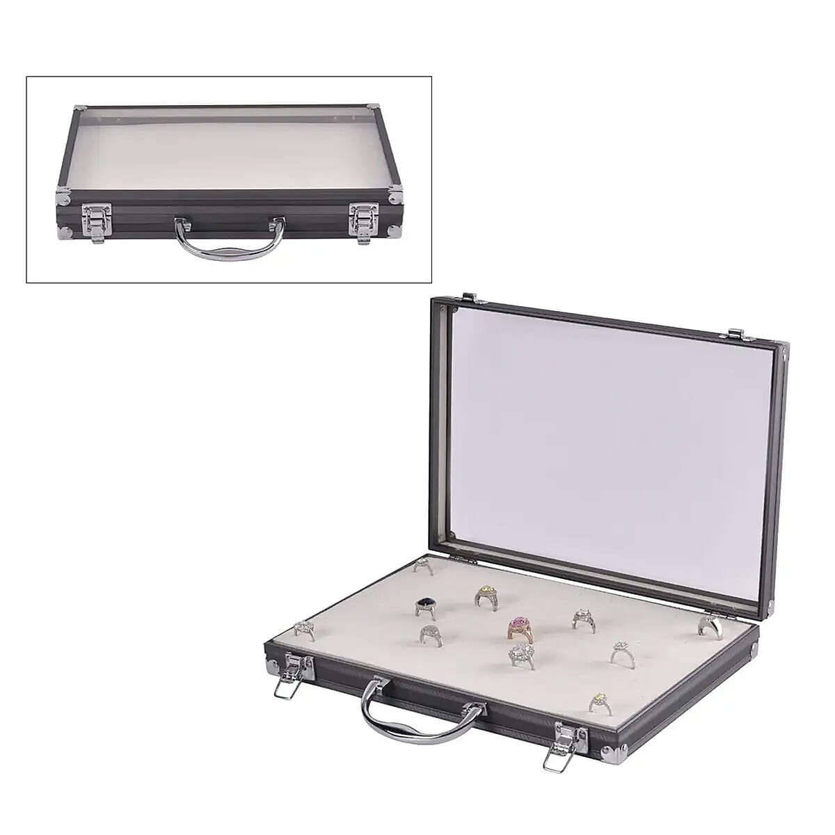 Gray Faux Leather Velvet Interior Ring Jewelry Box with Steel Color Lock and Handle