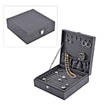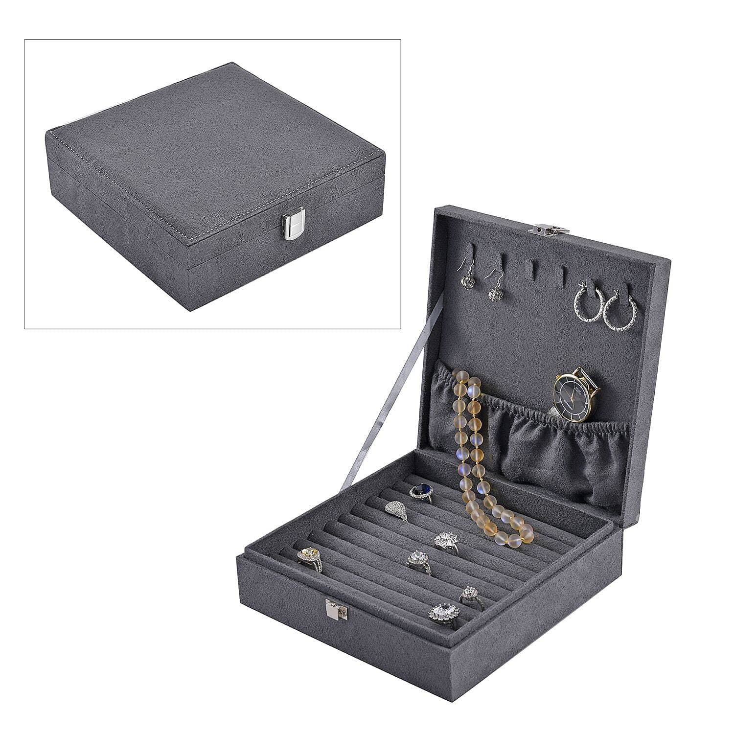 Gray Velvet Anti Tarnish Jewelry Box with Latch Clasp (11 Ring Slot, 6 Hooks for Necklace, Pocket)