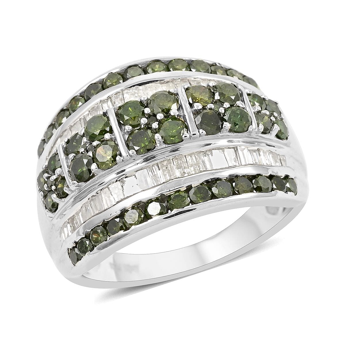 Green and White Diamond Cluster Ring in Platinum Over Sterling Silver (Size 8.0) 2.00 ctw