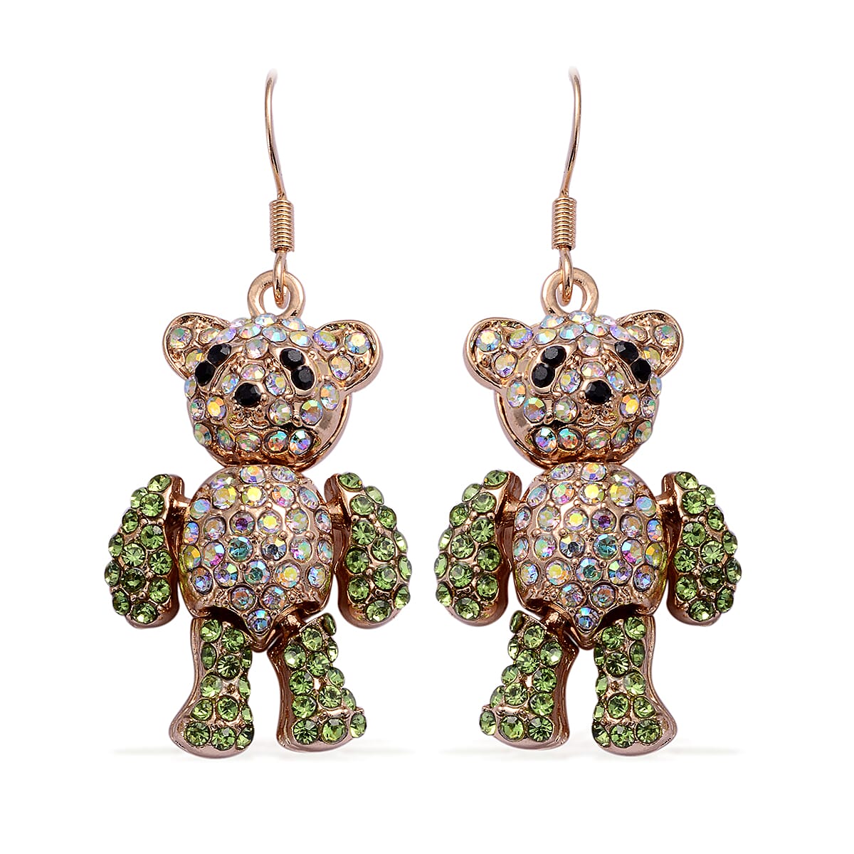 Green, Aurora Borealis and Black Austrian Crystal Teddy Bear Earrings in Goldtone and ION Plated Yellow Gold Stainless Steel