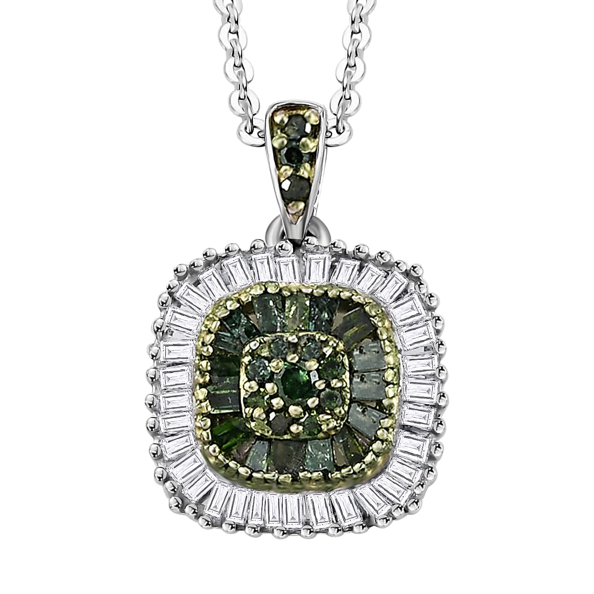 Green Diamond Cluster Pendant Necklace, White Diamond Accent Pendant Necklace, 20 Inch Pendant Necklace in Rhodium and Platinum Over Sterling Silver 0.50 ctw