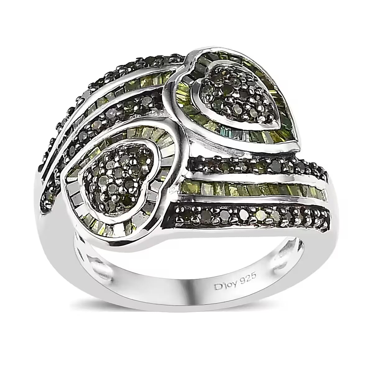 Green Diamond Cluster Ring, Diamond Bypass Ring, Green Diamond Ring, Diamond Hearts Ring, Platinum Over Sterling Silver Ring, Diamond Gift For Her, Wedding Ring 1.00 ctw (Size 5.00)