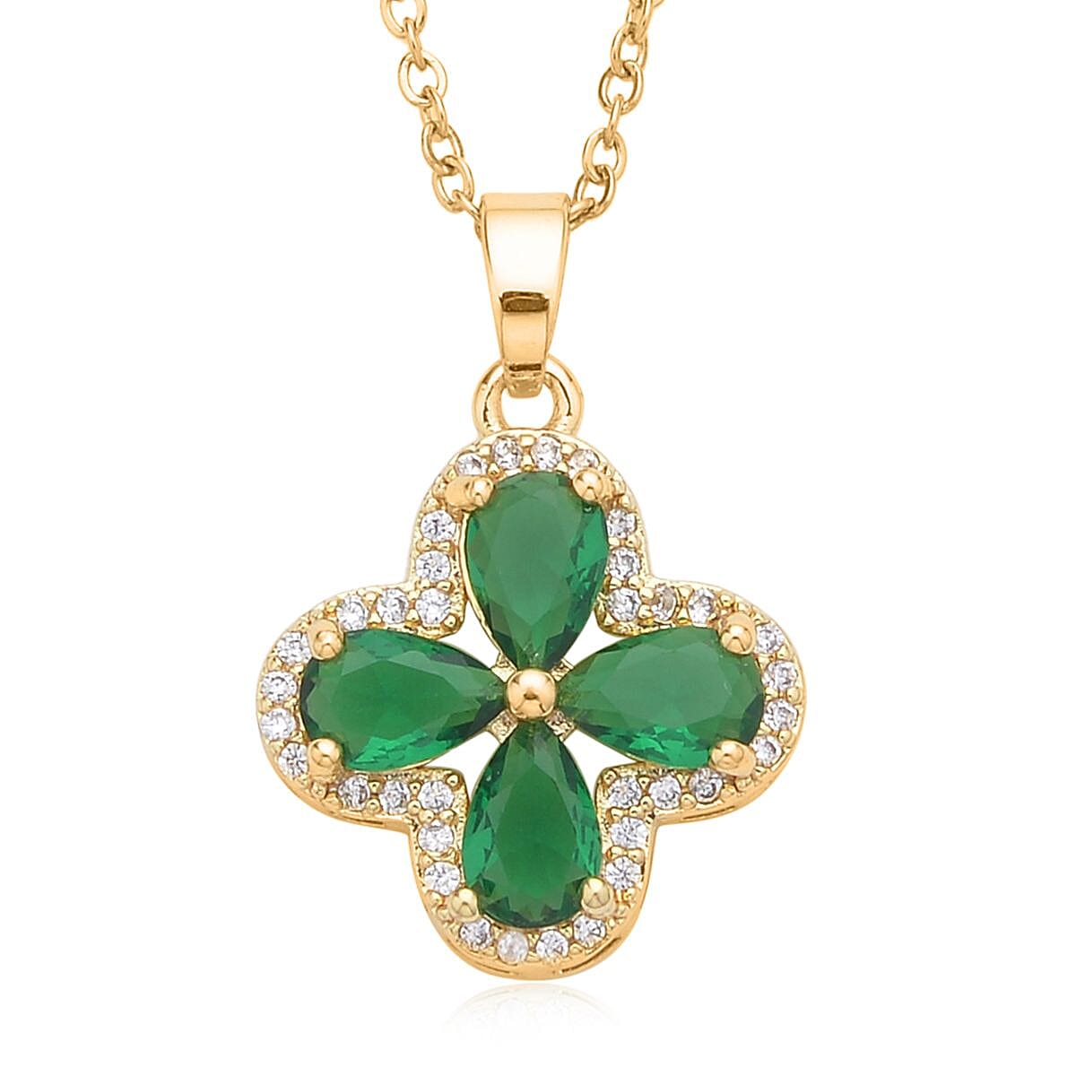 Green Glass and Simulated Diamond Four-petal Flower Necklace 20-22 Inches in Goldtone 0.10 ctw