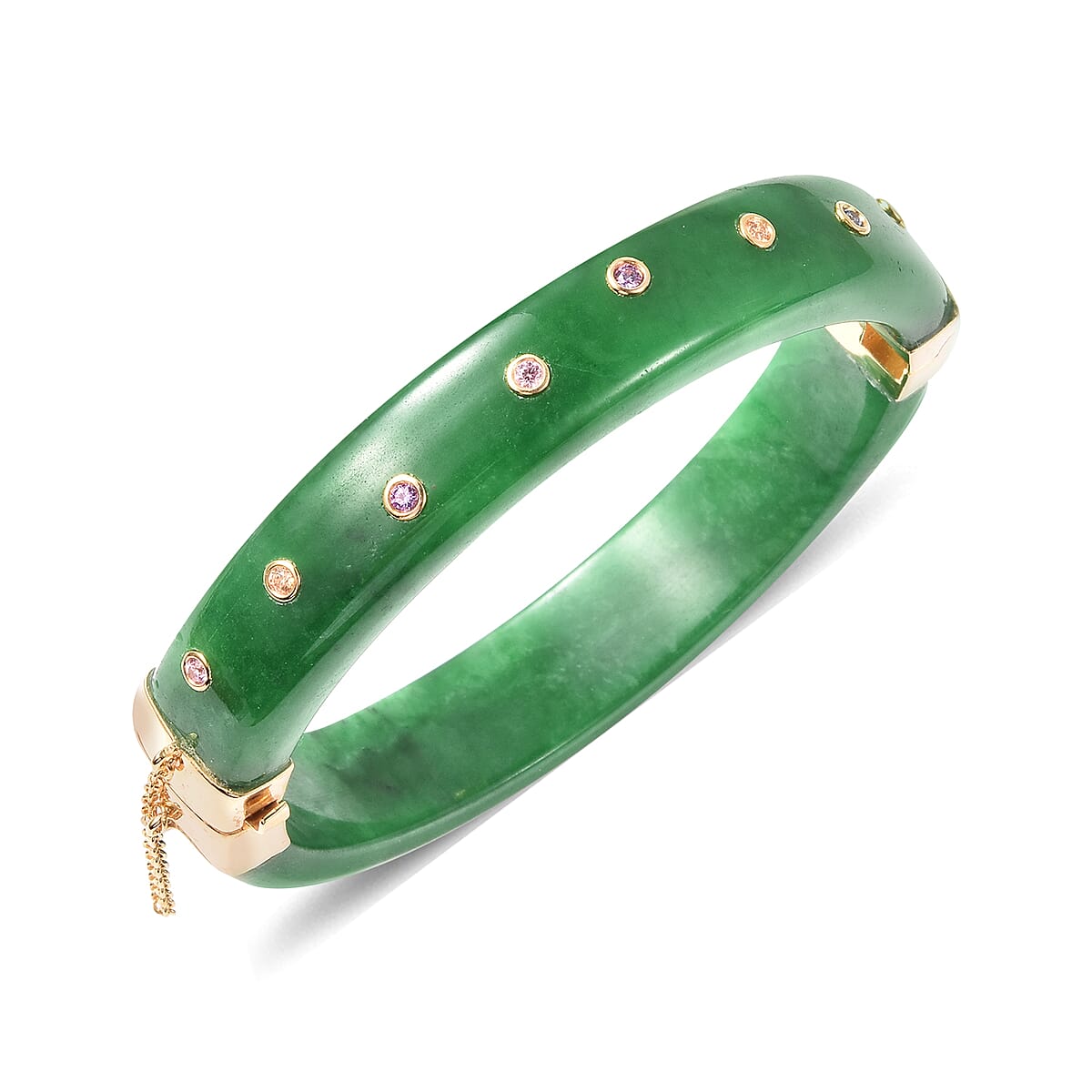 Green Jade Bangle Bracelet in 14K Yellow Gold Over Sterling Silver (7.25 in) Made with Finest Multi Color CZ 13.20 Grams 191.00 ctw
