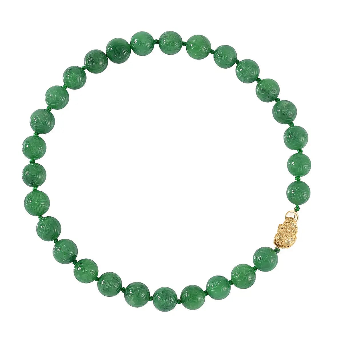 Green Jade Beaded Necklace, Dragon Frog Motif Necklace, 18 Inch Vermeil Yellow Gold Over Sterling Silver Necklace, Jade Jewelry 670.40 ctw