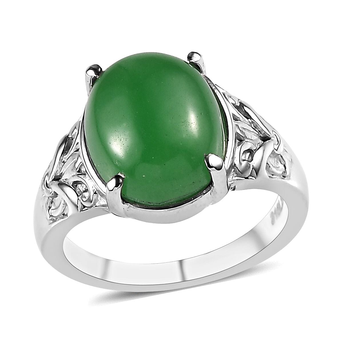 Immerse yourself in timeless elegance with this vibrant jade solitaire ring. Crafted from durable stainless steel, this single stone ring features a prong-set oval-shaped jade at its center, complemented by intricate scrollwork along the shank.