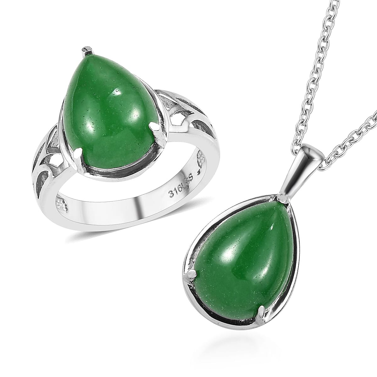 Green Jade (D) Solitaire Ring (Size 9.0) and Pendant Necklace 20 Inches in Stainless Steel 14.20 ctw