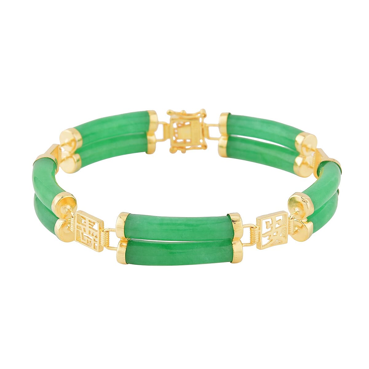 Green Jade (D) Two Layers of Cylindrical Tubes Chinese Characters Bracelet in 14K Yellow Gold Over Sterling Silver (7.00 In) 61.50 ctw
