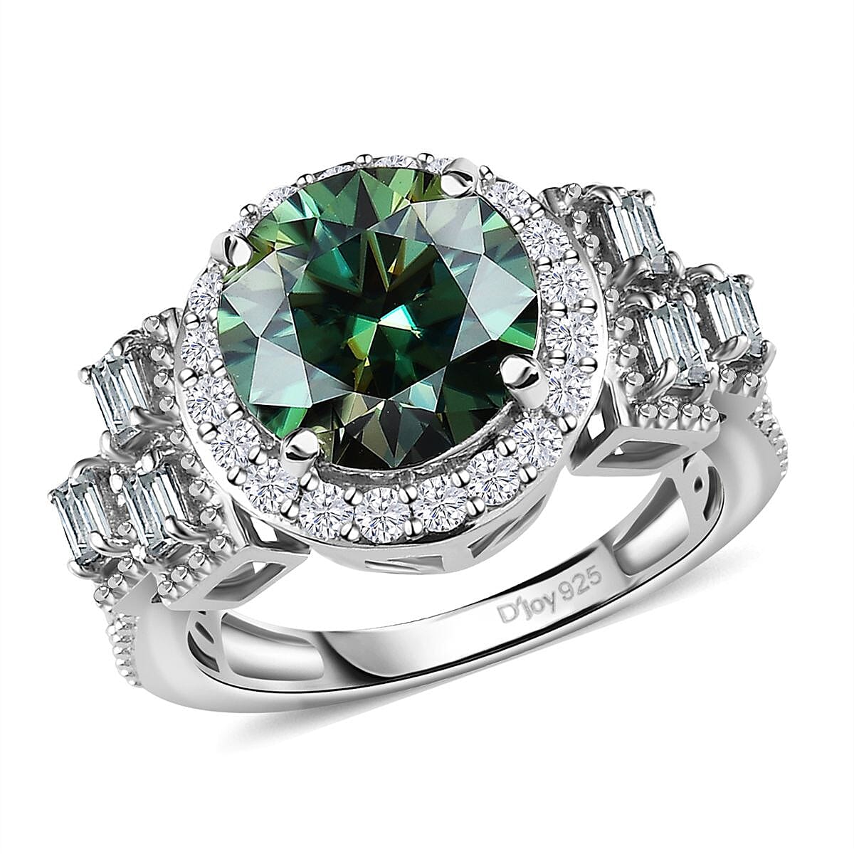 Step into a world of elegance and sophistication with our exquisite green moissanite and moissanite halo ring in platinum over sterling silver. Crafted to perfection, this mesmerizing piece encapsulates the allure of nature's finest hues while exuding a timeless charm that effortlessly captivates the beholder. Let this radiant moissanite fashion ring for women be the statement piece that adds a touch of enchantment to your every ensemble.