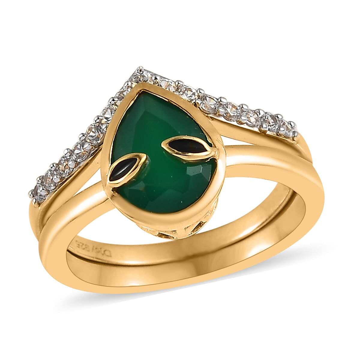 Green Onyx and White Zircon Chevron Alien Band Ring Set Ring in Vermeil Yellow Gold Over Sterling Silver (Size 9.0) 2.00 ctw
