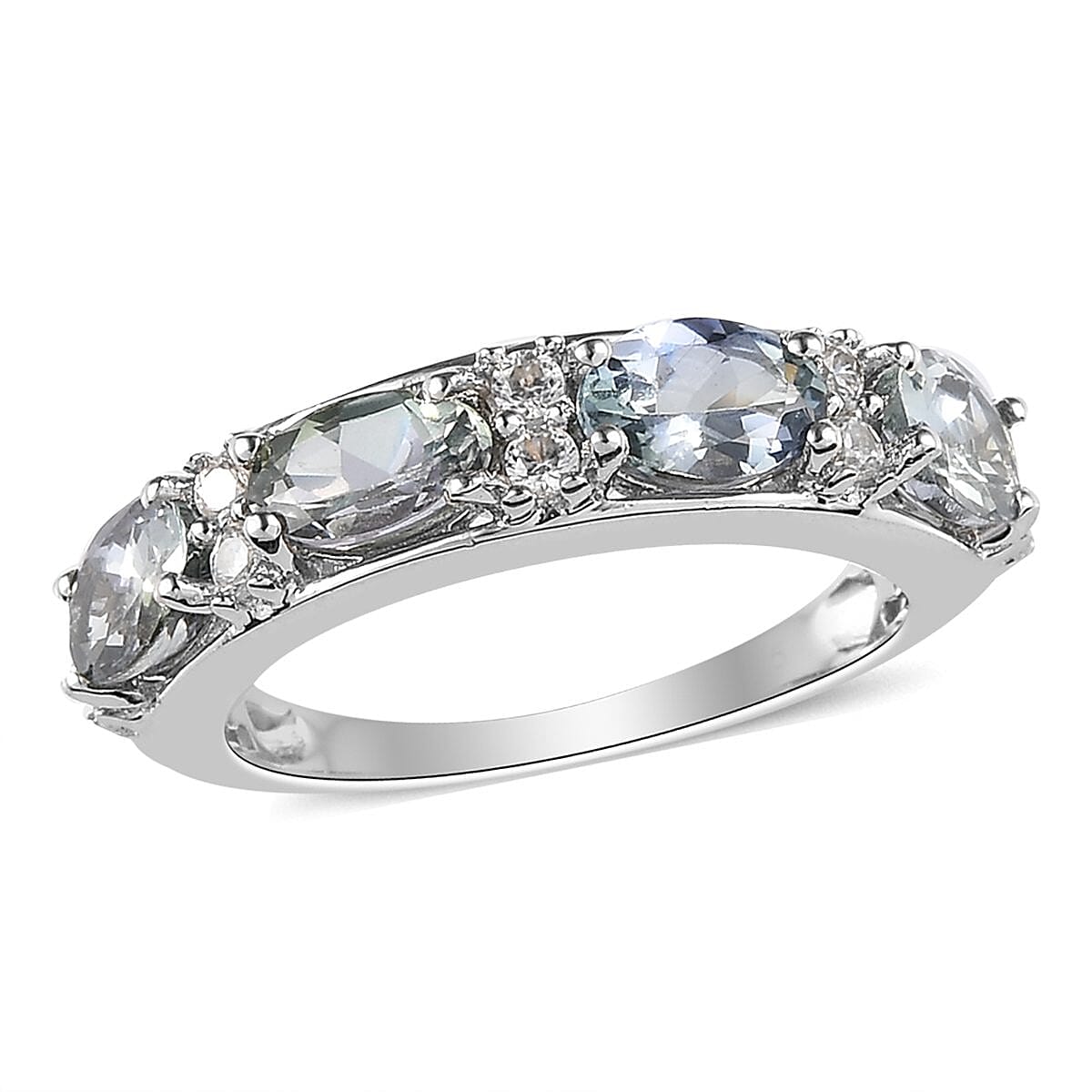 The serenity of nature where the green forest is covered with snow inspires this green tanzanite ring. This ring features a seamless arrangement of oval-shaped gems highlighted by natural white zircons that resembles the same appearance. The placement of oval-shaped gems in an east-west direction gives a distinctive look to the piece. Set beautifully in prongs each gem illuminates more fire and brilliance. A rare creation of earth-Green tanzanite displays a rare color, which only 1% of the total mined tanzanite exhibits. Tanzanite is a rare gem and with the history of being formed 585 million years ago in the foothills of a mountain, the pleochroism phenomenon it exhibits makes this five-stone ring more adorable. The hardness of the gem makes this sterling silver crafted ring suitable for everyday wear.