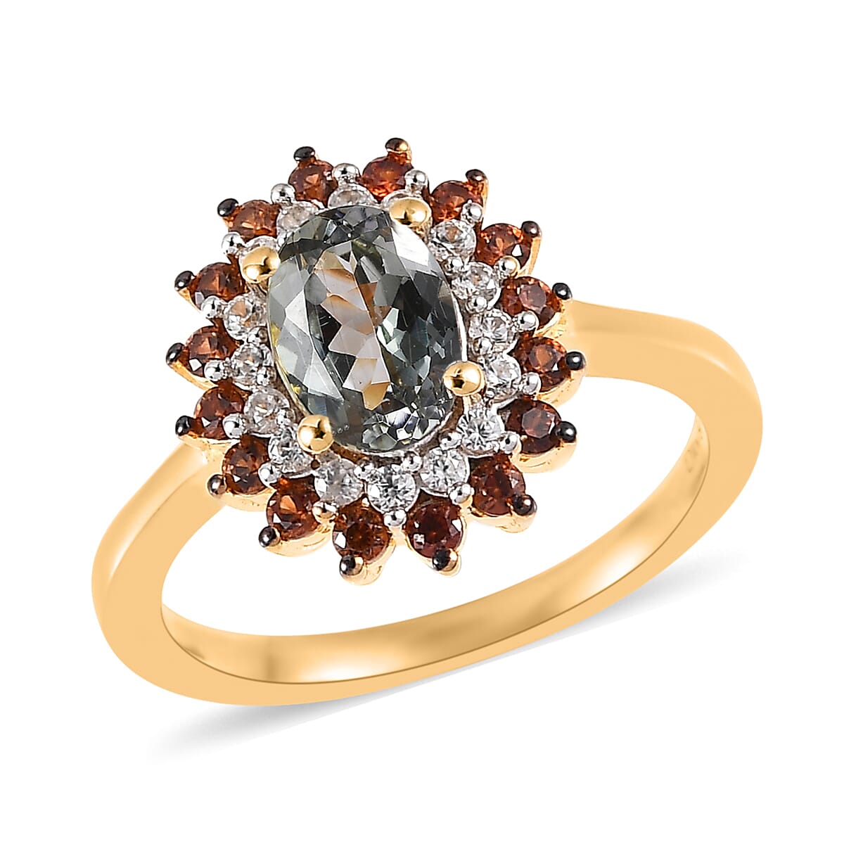 Green Tanzanite, Brown and White Zircon Sunburst Ring in Vermeil Yellow Gold Over Sterling Silver (Size 6.0) 1.50 ctw