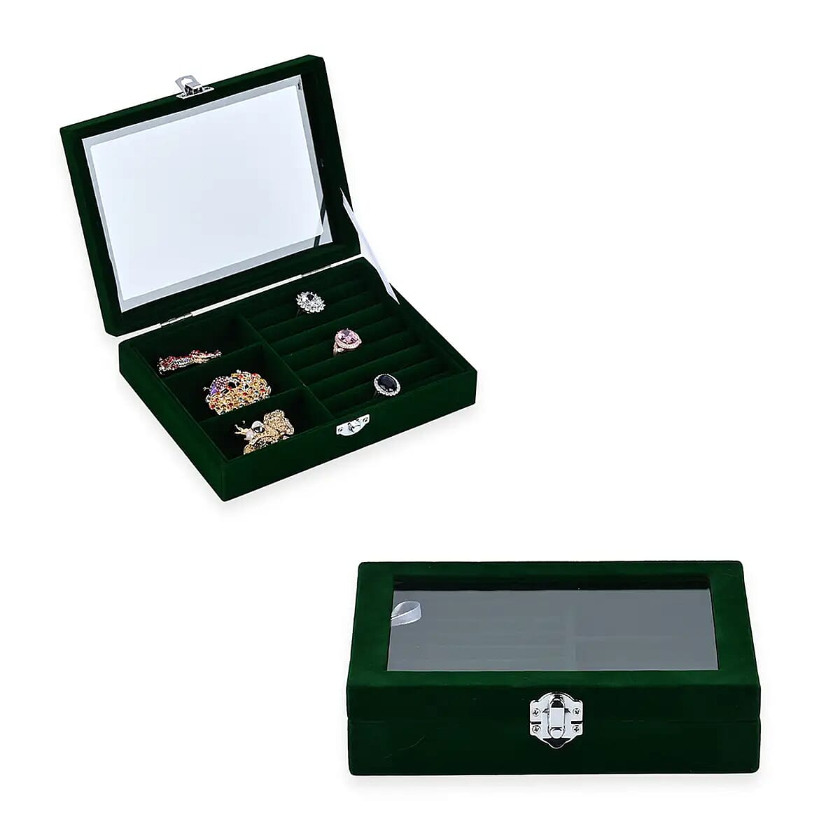Green Velvet Jewelry Box with Anti Tarnish Lining & Lock (Rings Hold Up to 28, Brooch, Pendant, Earrings)