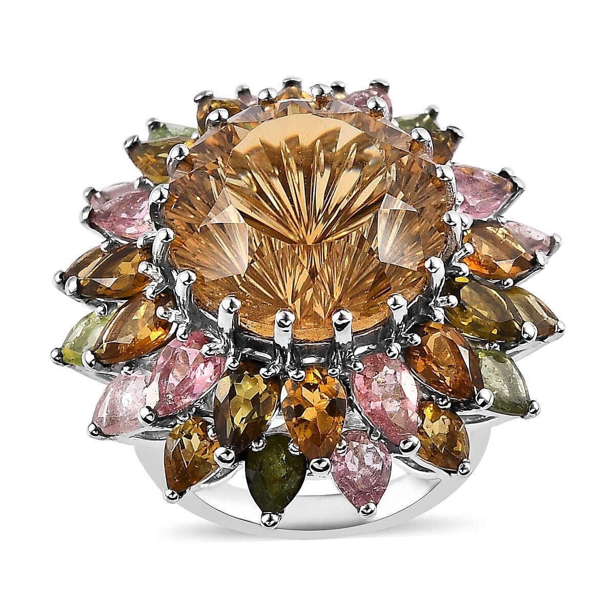 Hanabi Cut Brazilian Citrine and Multi-Tourmaline 16.10 ctw Firework Ring in Platinum Over Sterling Silver (Size 10.0)