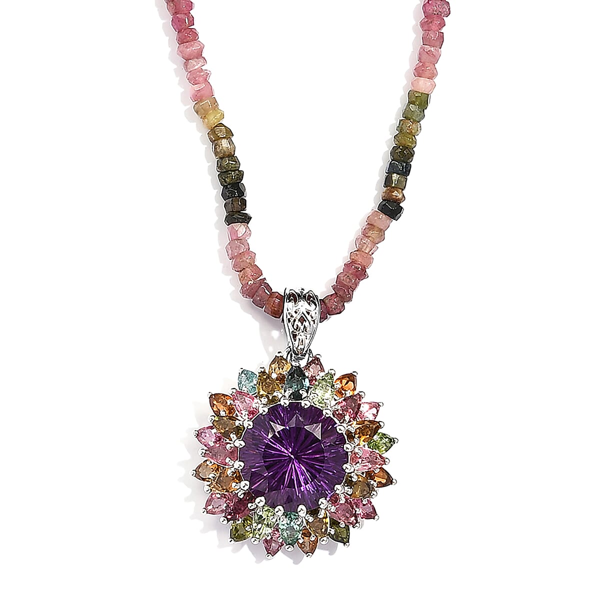 Hanabi Cut Zambian Amethyst, Multi-Tourmaline Firework Pendant with Beaded Necklace (20 Inches) in Platinum Over Sterling Silver (17.70 g) 50.75 ctw