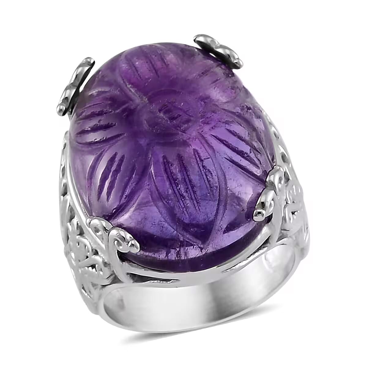 Hand Carved African Amethyst Dragon Flower Ring in Stainless Steel (Size 6.0) 5.00 ctw