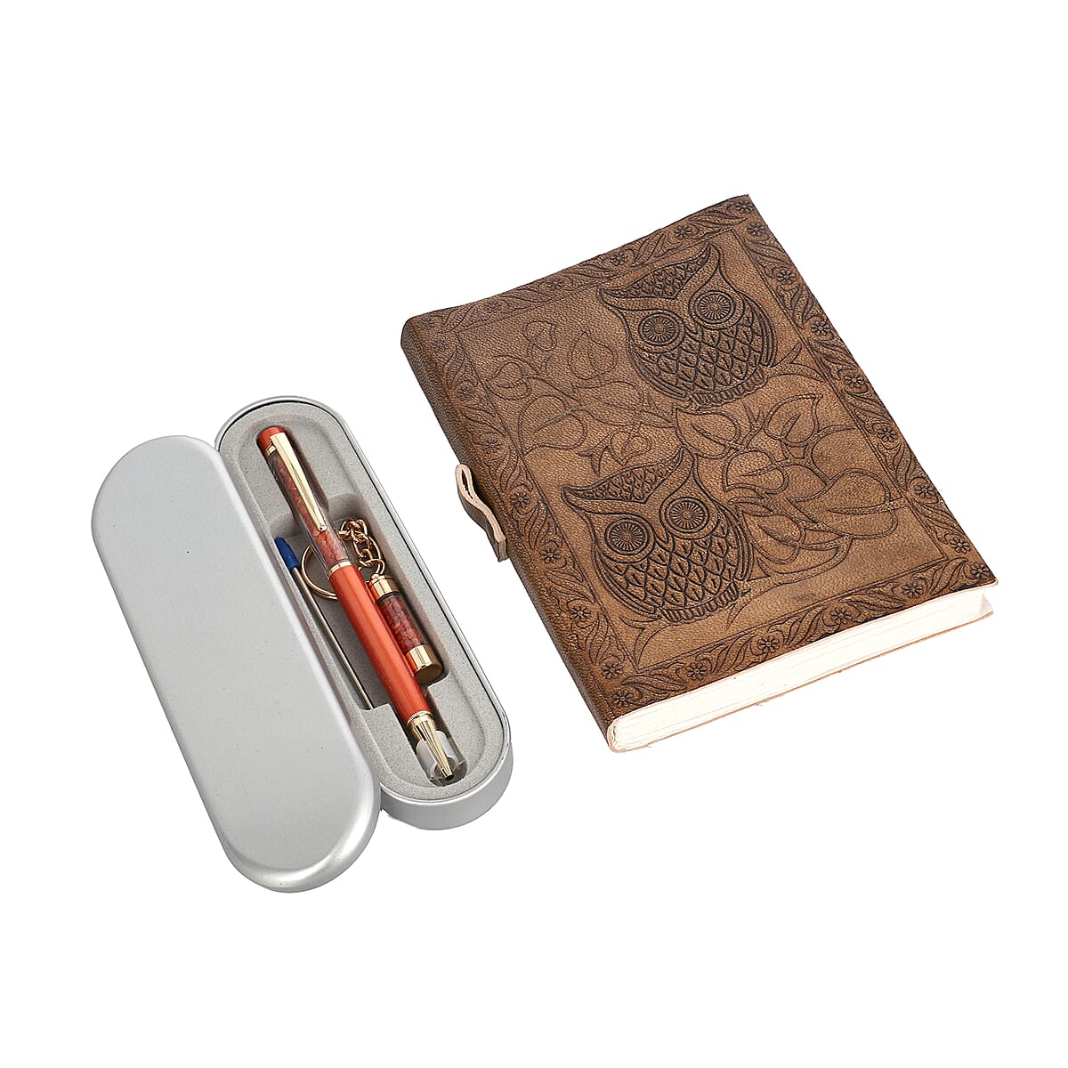 Hand Embossed Owl Genuine Leather Diary with Handmade Papers & Fire Opal filled Ball Pen with Extra Refill , Stationery Set , Unique Corporate Gifts , Personalized Stationery Sets , Gift Item