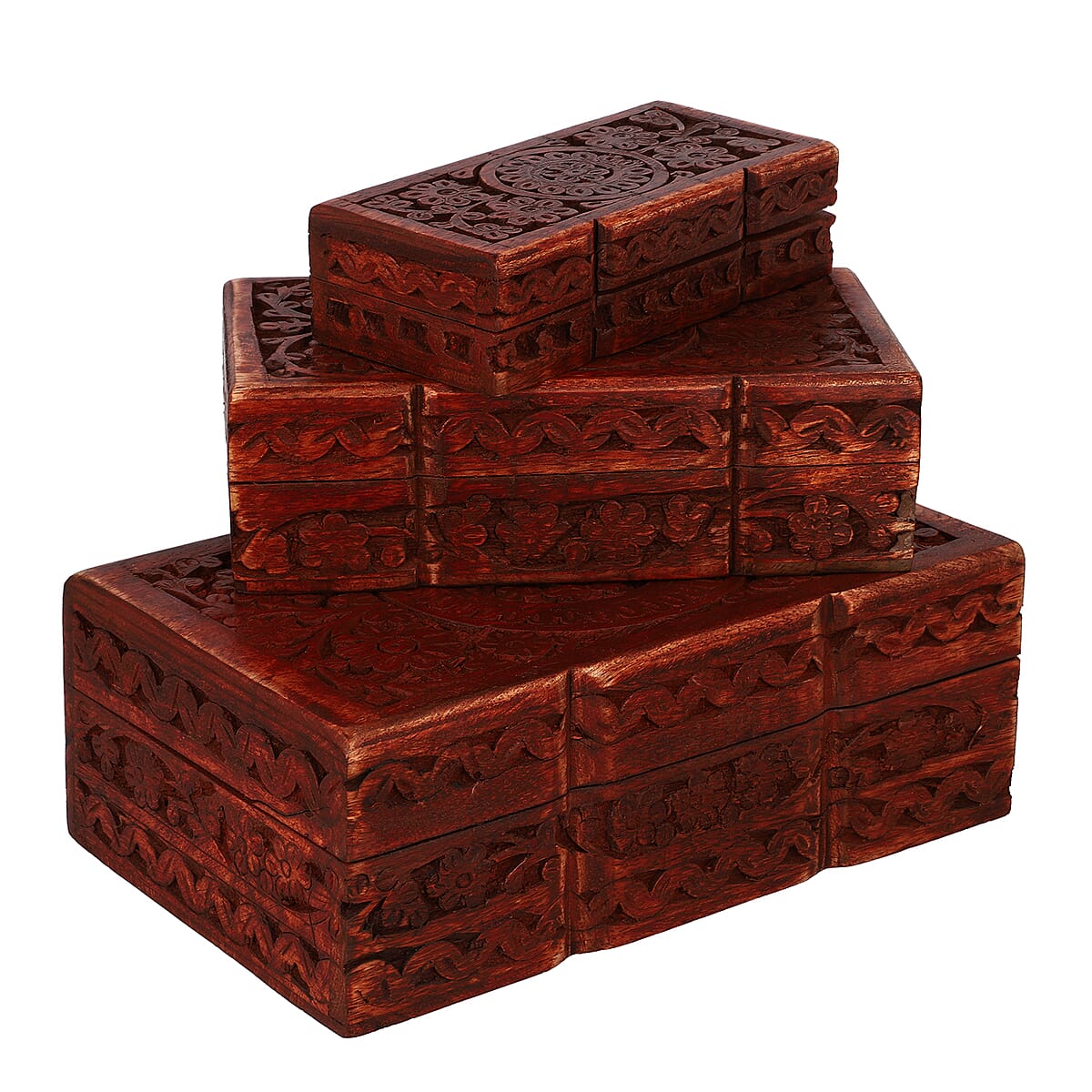 Handcraft Set of 3 Floral Carved Finished Mango Wooden Nesting Boxes