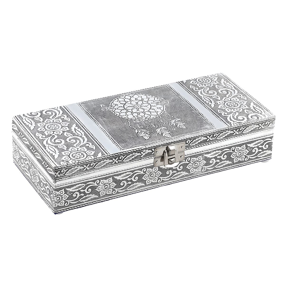 This handcrafted jewelry box is crafted from embossed aluminum that has been oxidized to give it a unique, vintage appearance. The intricate embossing adds a touch of elegance, making this jewelry organizer a practical piece for storing jewelry and a decorative item for any space.