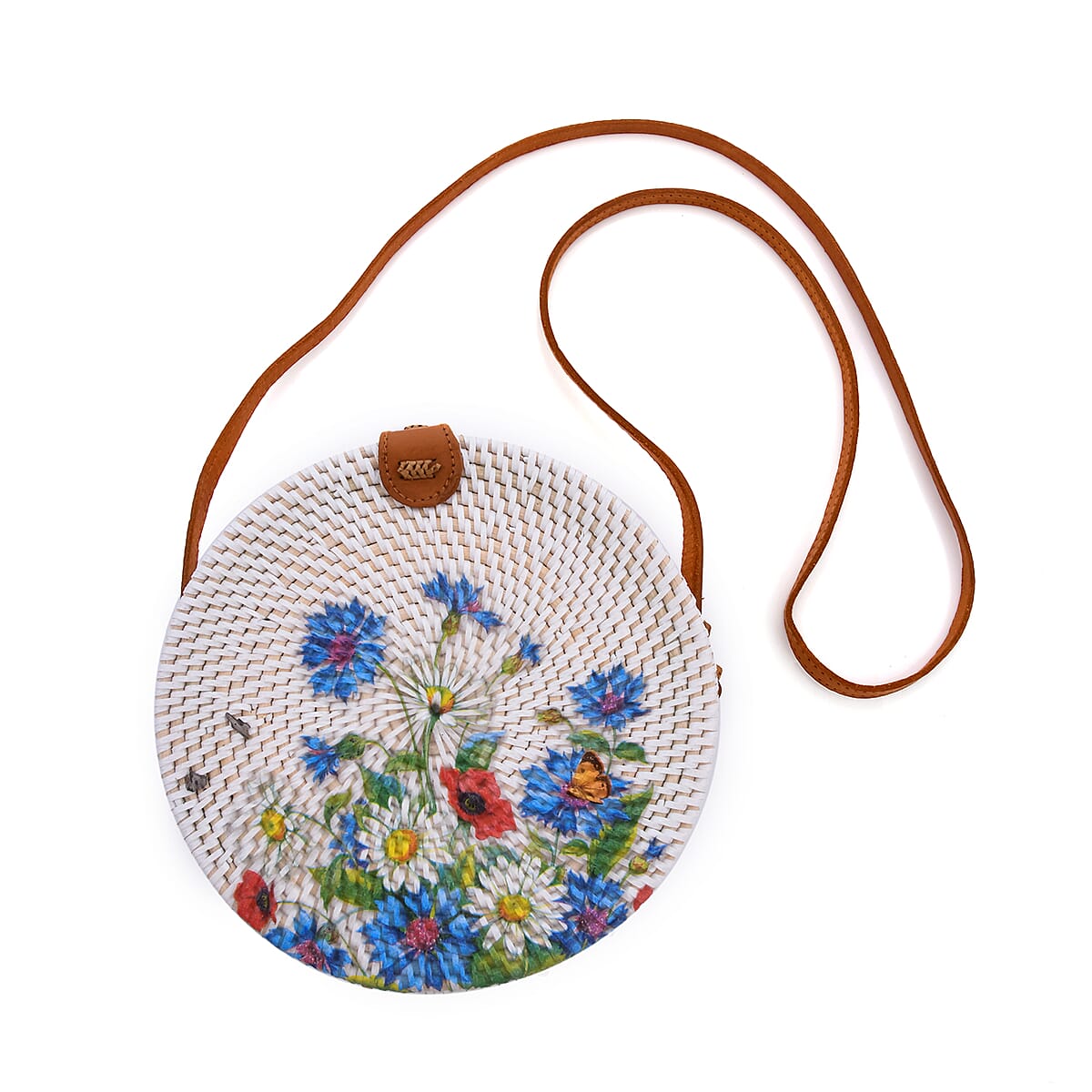 Handcrafted Flower Garden Pattern Round Rattan Crossbody Bag with Genuine Leather Strap