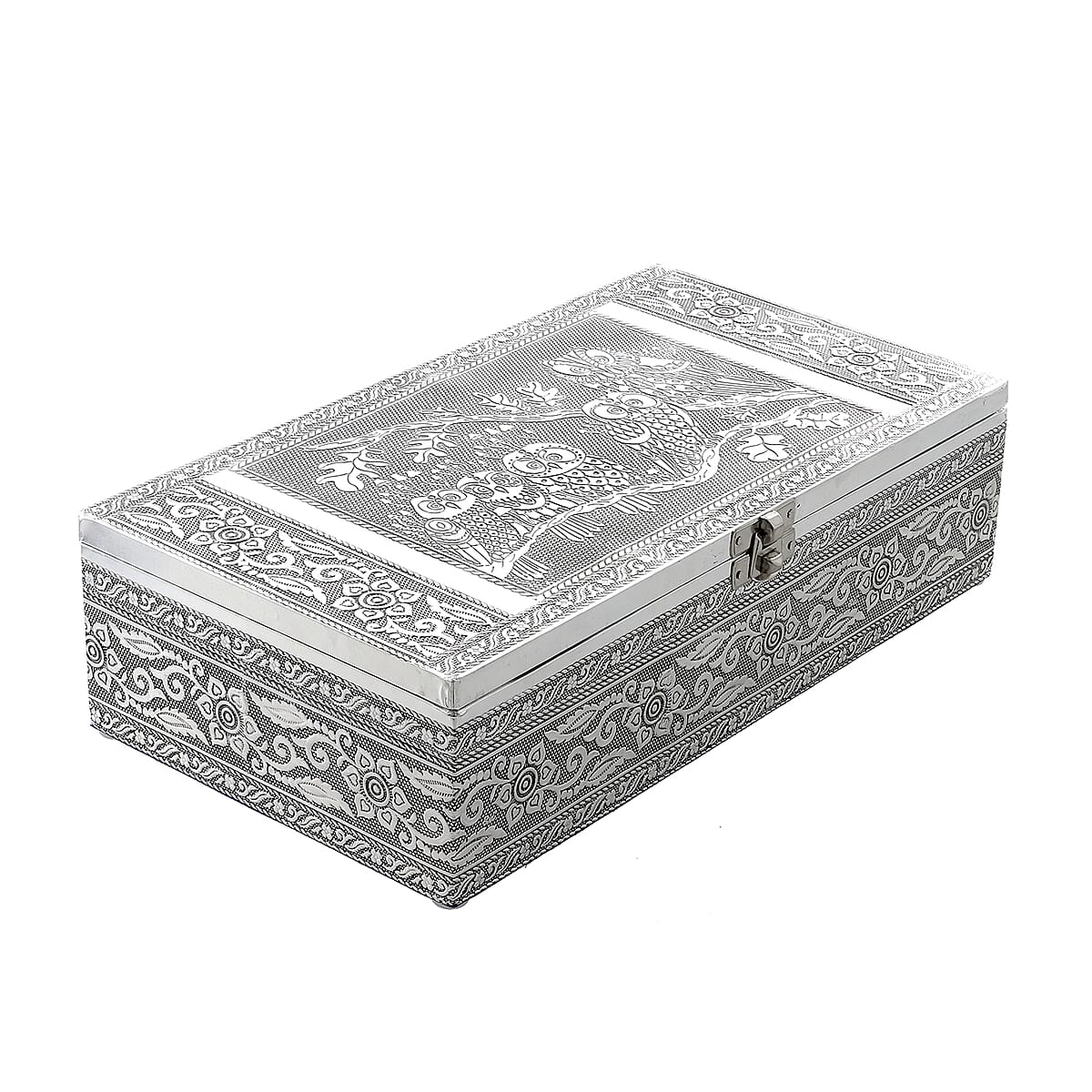 Introducing the handcrafted embossed aluminum oxidized storage box - a stunning and practical addition to any home. Made from high-quality materials, this storage box is durable and elegant, making it the perfect choice for storing your treasured items. The jewelry box features intricate embossed patterns expertly handcrafted by skilled artisans. The oxidized finish gives it a unique, vintage look, making it a true statement piece that will add character to any room. Its spacious interior makes this box perfect for storing jewelry, keepsakes, or other small items. The lid is easy to open and close, ensuring your items stay safe and secure.