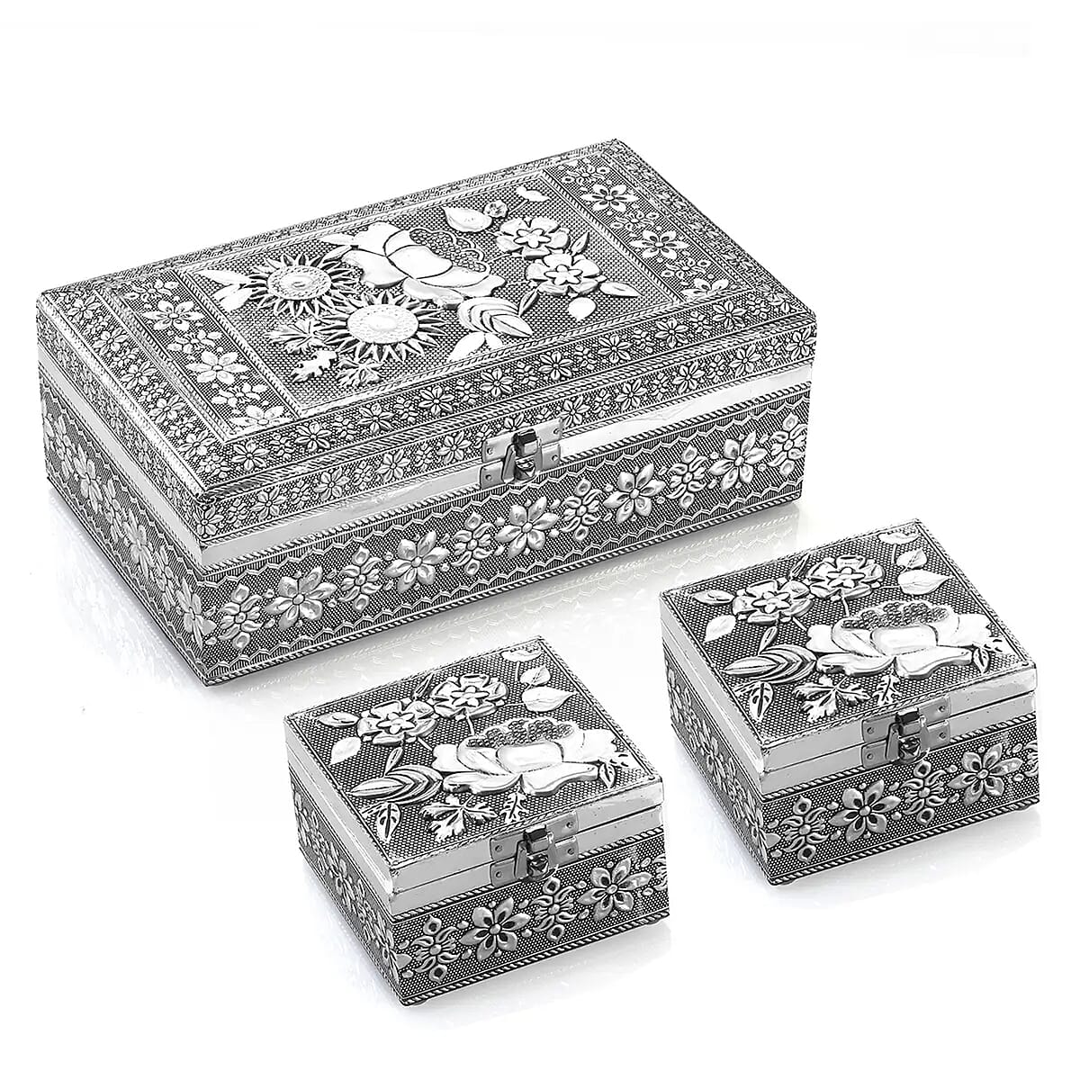 This handcrafted set of 3 3D embossed aluminum oxidized storage boxes features one main compartment and a lock closure. These storage boxes are anti-tarnish and scratch-resistant, providing durable and secure storage. Each box is meticulously handcrafted, ensuring unique detailing and quality.