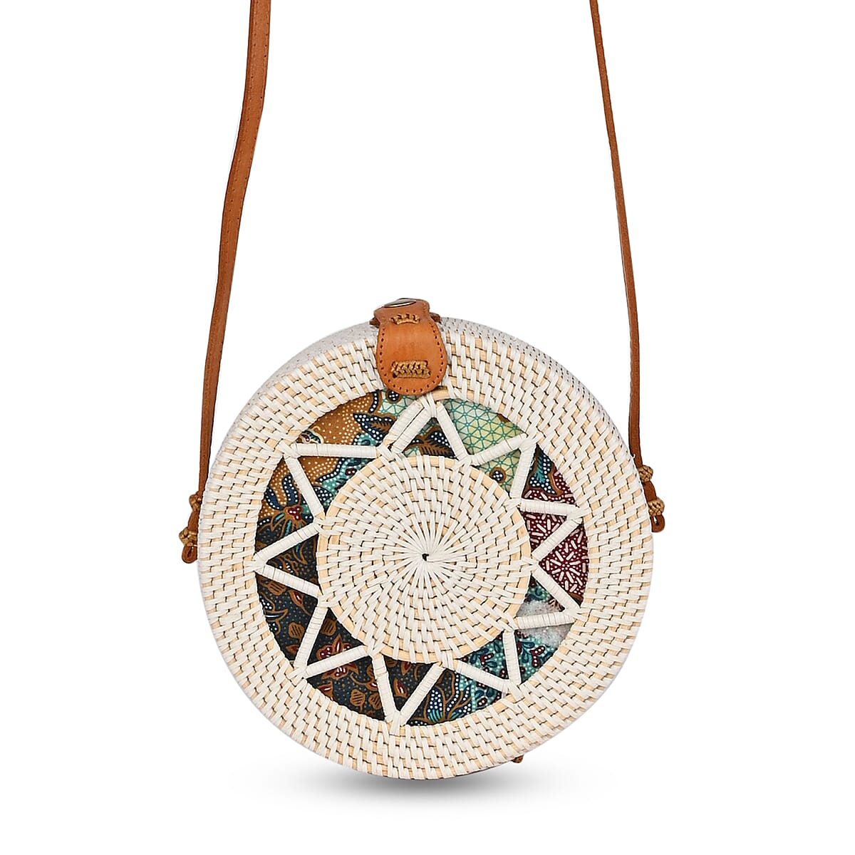 Handwoven Cukli Wooden Painted Round Rattan Bag with Leather Shoulder Strap