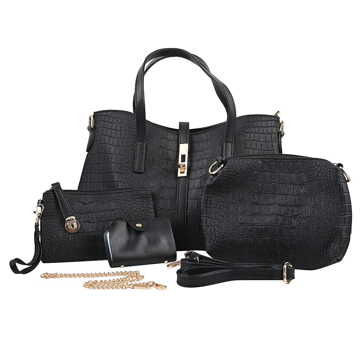 HARPER AND HYDE Designer Closeout Set of 4 Black Croco Embossed Vegan Leather Satchel, Crossbody Bag, Wristlet, Card Case