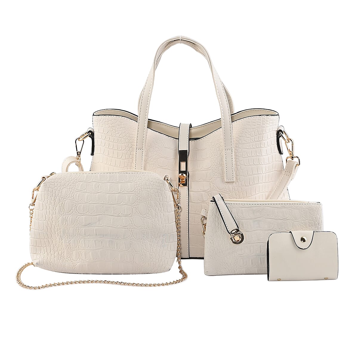 HARPER AND HYDE Designer Closeout Set of 4 White Croco Embossed Vegan Leather Satchel, Crossbody Bag, Wristlet, Card Case