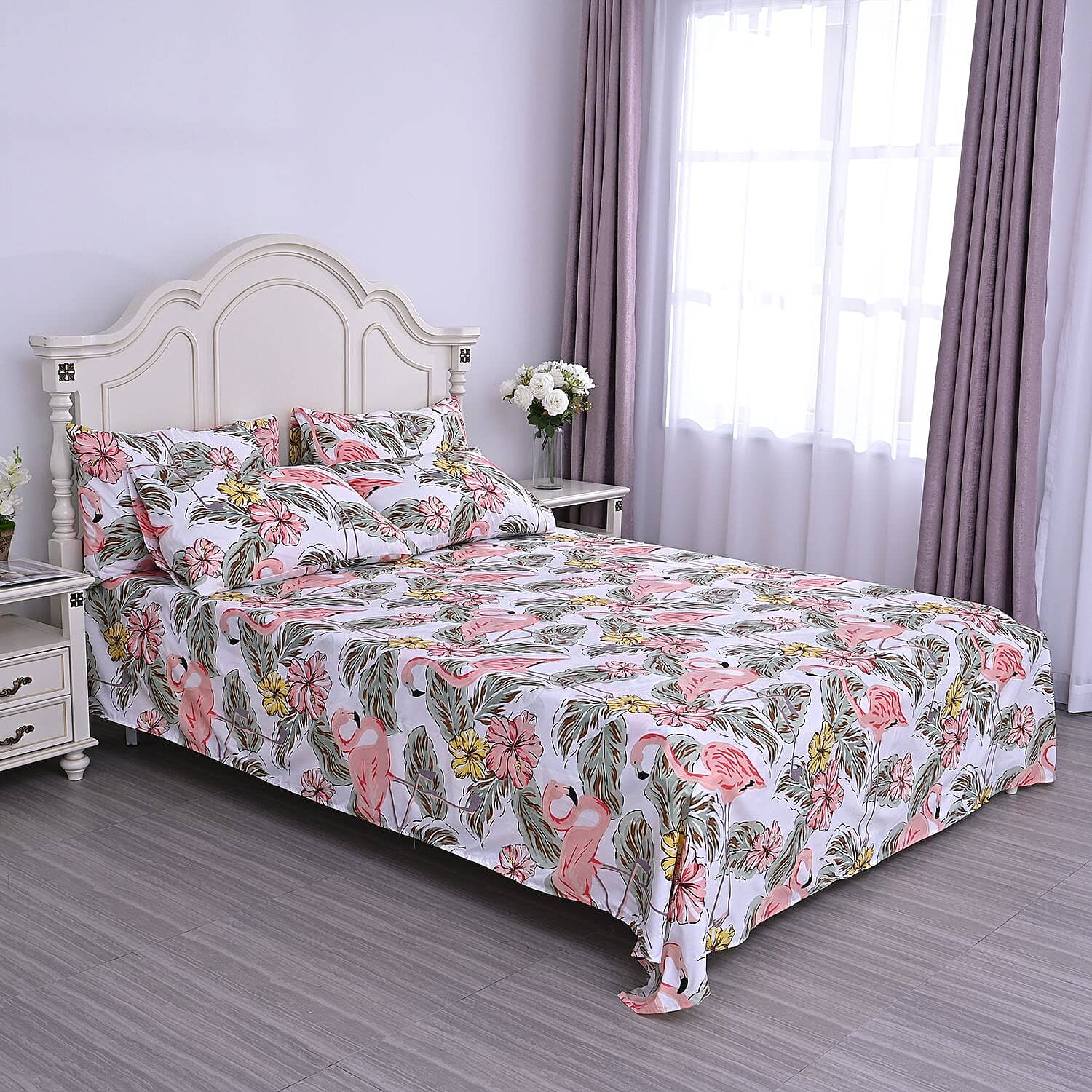 Homesmart Flamingo and Flower Print Pattern 6 Pcs Microfiber Sheet Set (with 14 Deep Pocket) - Queen , Bed Sheets , Fitted Sheet , Bed Sheet Set , Microfiber Sheets